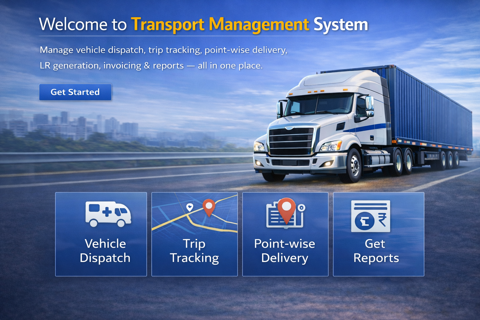 Manage dispatch, trips, delivery tracking, invoices and reports — all in one dashboard.